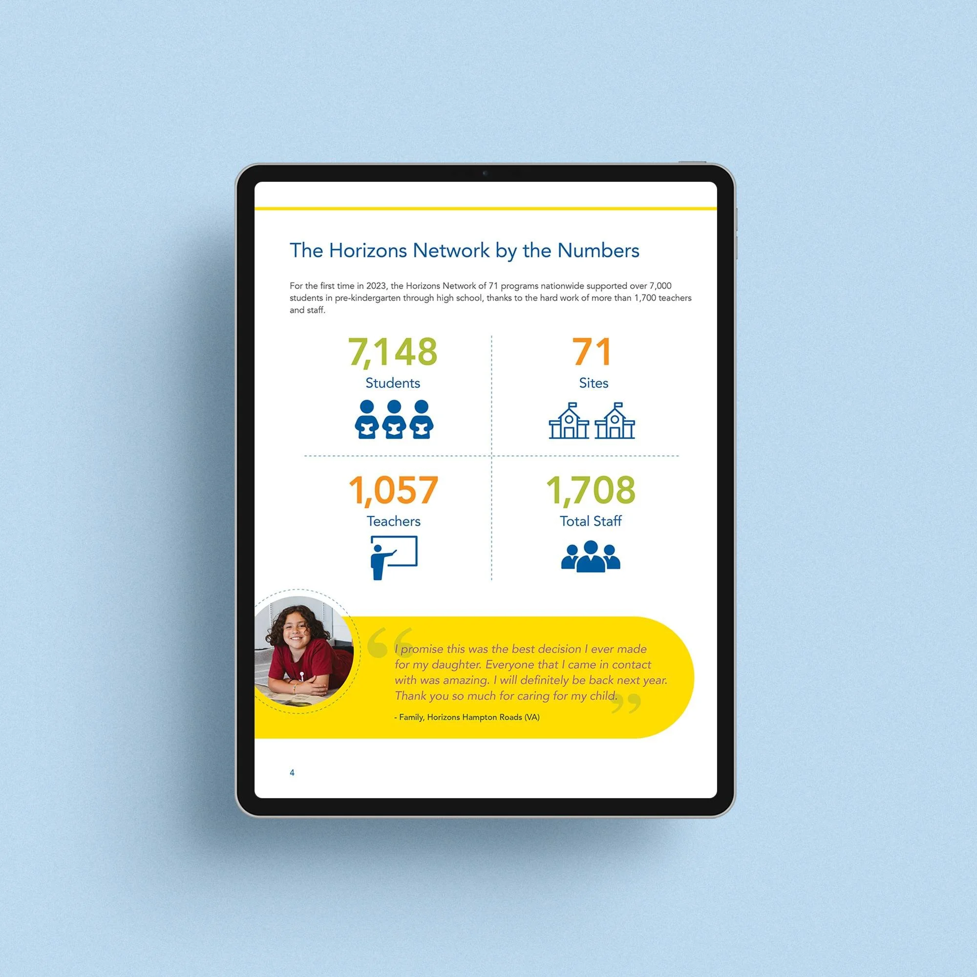 Horizons National is a nonprofit that supports a network of learning programs serving children. They wanted to gain the trust of fundraisers and donors by highlighting the impact of their programs. Natsumi Nishizumi Design partnered with Prosper Strategies, a marketing agency for nonprofits, to create an annual report using infographics and charts to highlight the results and messaging for Horizons National.