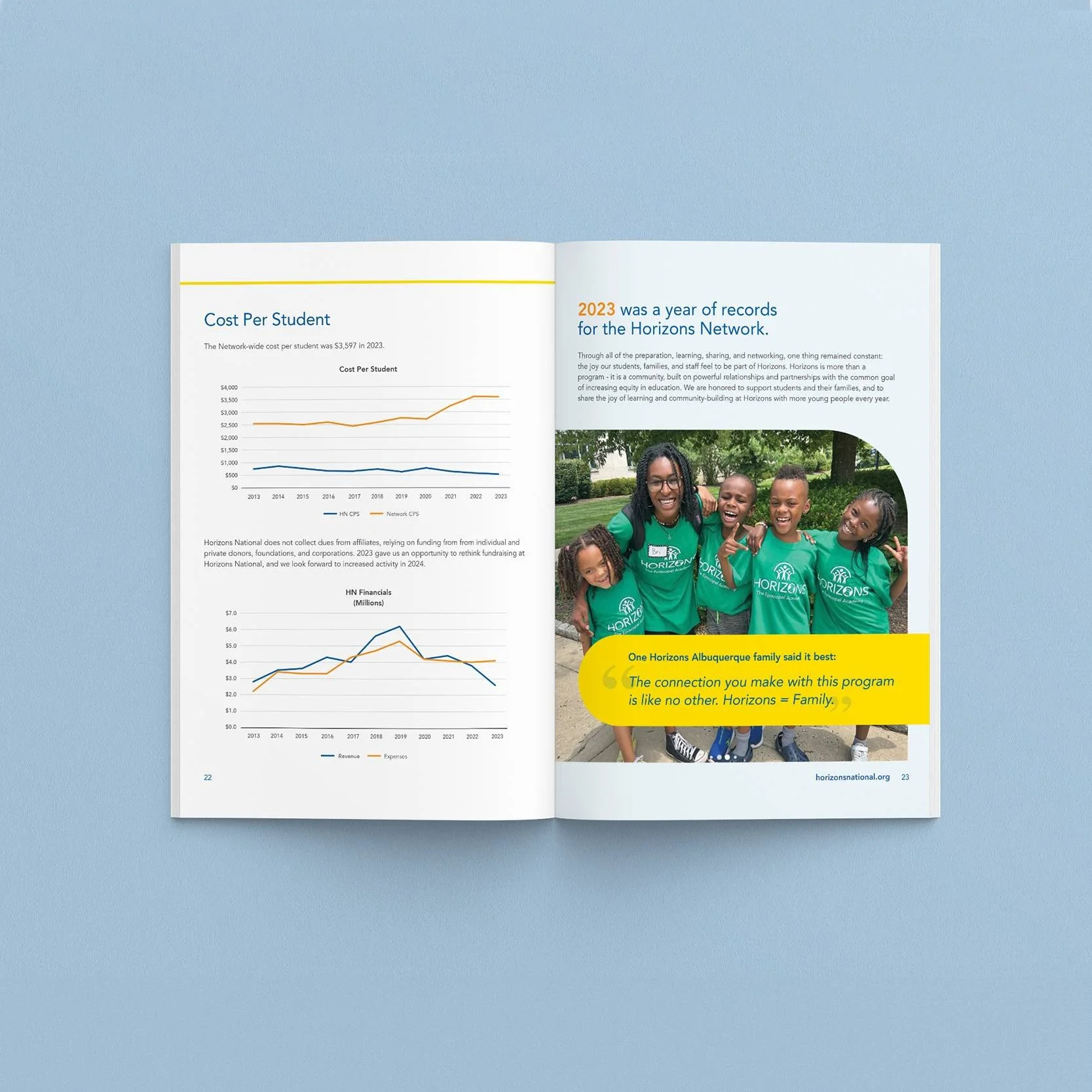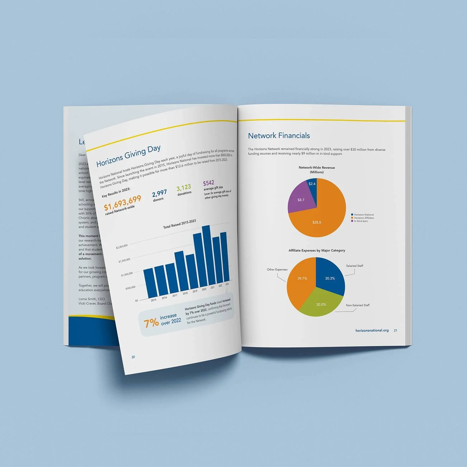 Natsumi Nishizumi Design was proud to partner with Horizons National, a trusted nonprofit organization, to design their annual reports for 2021 and 2022—highlighting their meaningful impact through clear, engaging visuals.